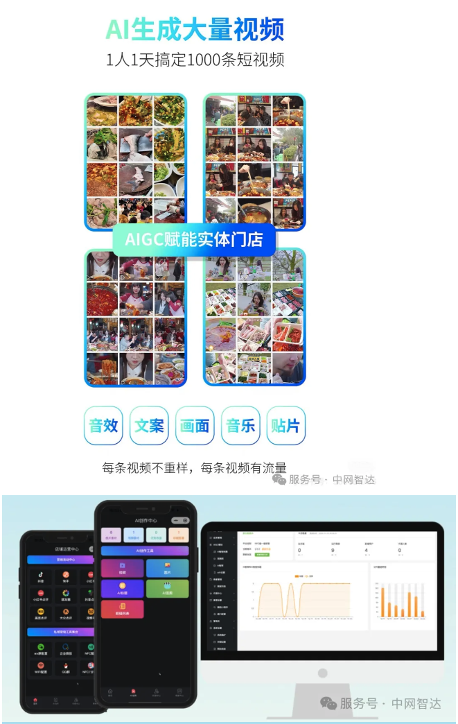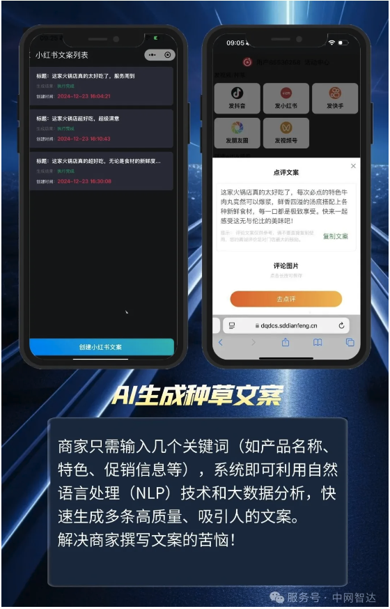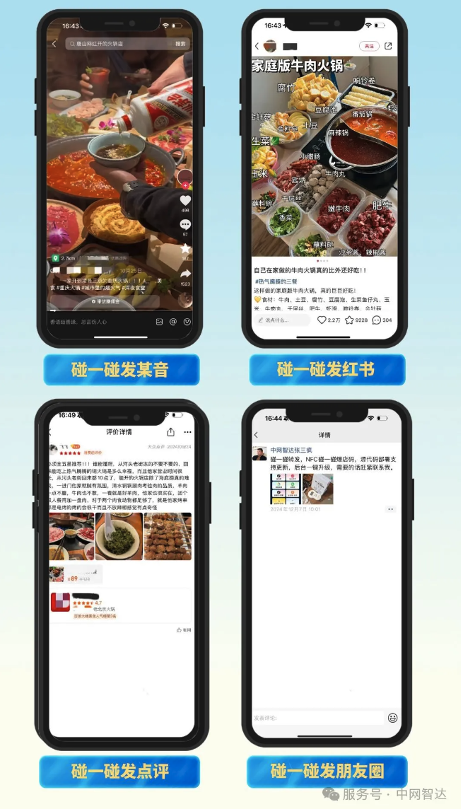 中网智达紧跟市场步伐,开发AI多渠道碰一碰营销系统,集成了先进的人工智能技术,自动生成精美的探店视频以及种草营销文案,只需用手机轻轻一碰,再点击一下,便可一键分享至抖音、小红书、微信等社交平台,也能一键连接wifi。帮助商家精准营销,实现流量裂变放大,持续性引流拓客;商家还可使用团购外卖小程序做流量承接,通过小程序营销功能实现私域营销。