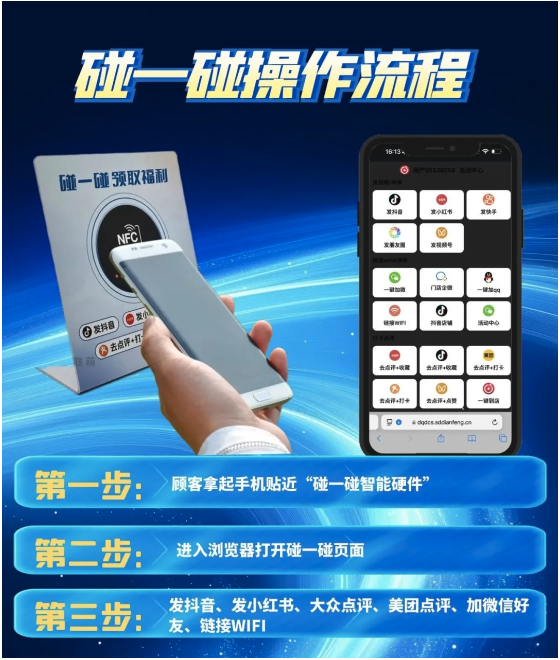 零售行业:商家可以在店铺入口或商品展示区设置碰一碰设备,顾客通过碰触即可获取优惠信息、商品详情或进入在线商城。